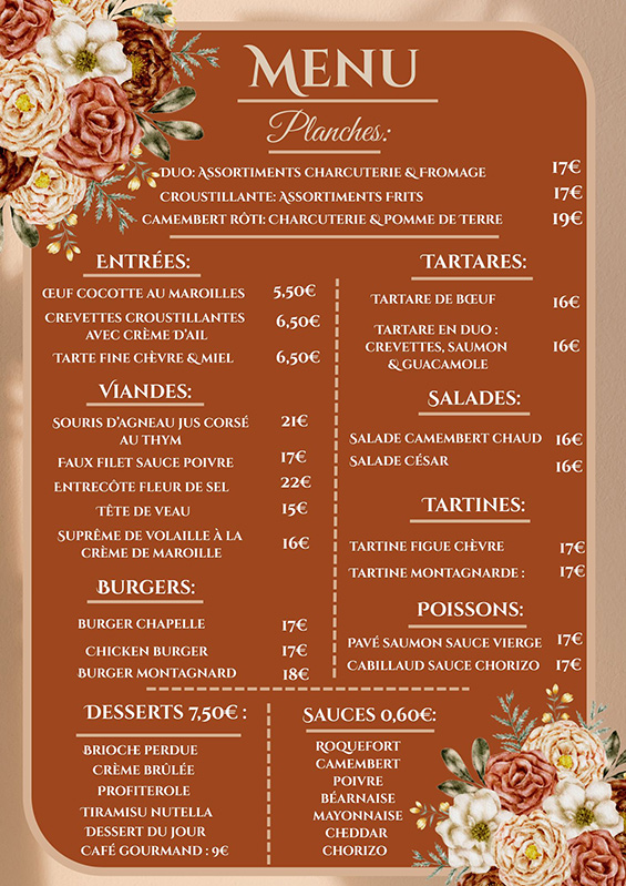Le restaurant La Chapelle vous propose aussi une variété de salades, planches et tartines... ainsi qu’un menu enfant